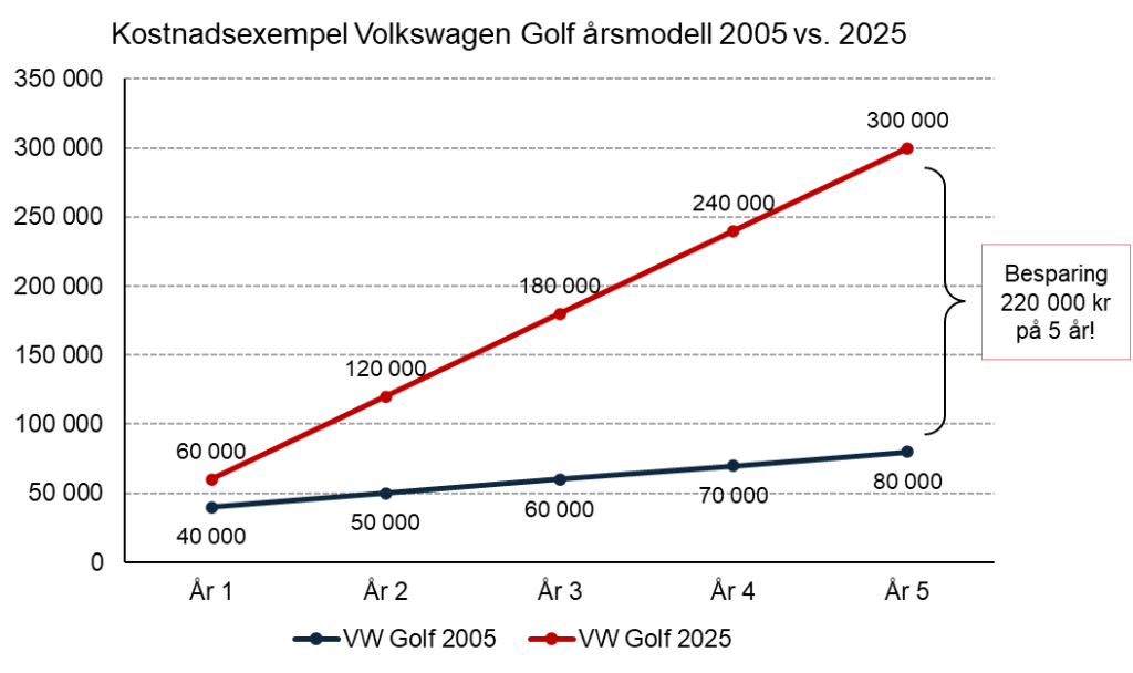En 20 år gammal Volkswagen Golf, årsmodell 2005, i fint skick har ett pris på ca 30 000 kr. Om vi budgeterar en service och reparationskostnad inklusive försäkring på 10 000 kr/år så innebär det en totalkostnad på 80 000 kr för 5 år.